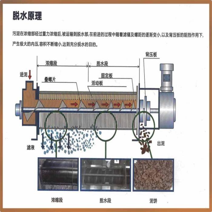 设备运行时,污泥 从进料口进入滤筒 后的、受到螺旋片的推送而向卸料口移动,由于螺旋轴旋片之前的螺距逐渐缩小,因此 污泥 所受的压力也随之不断增大,并在压差作用下开始脱水,水份从固定环与活动环片过滤间隙流出,同时设备依靠固定板和活动板之间的自清洗功能,清扫过滤间隙防止堵塞,泥饼经过充分的脱水后在螺旋轴的推进作用下从卸料口排出。根据污泥 性质不同本公司已研发出针对性机器,结构上更加实用,使用成本更低。
